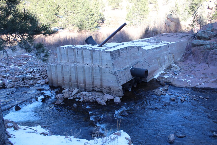 In the foothills outside Longmont, Colorado, tucked high in a narrow valley, sits an ugly, cement slab. It's the size of a train car and juts out into North St. Vrain Creek, a shallow alpine stream that serves as the city's main drinking water supply. A tiny sign greets hikers as they pass the structure. It reads: "Chimney Rock Dam." A small arrow points to the right. What the sign doesn't tell you is how that cement slab ended up there.